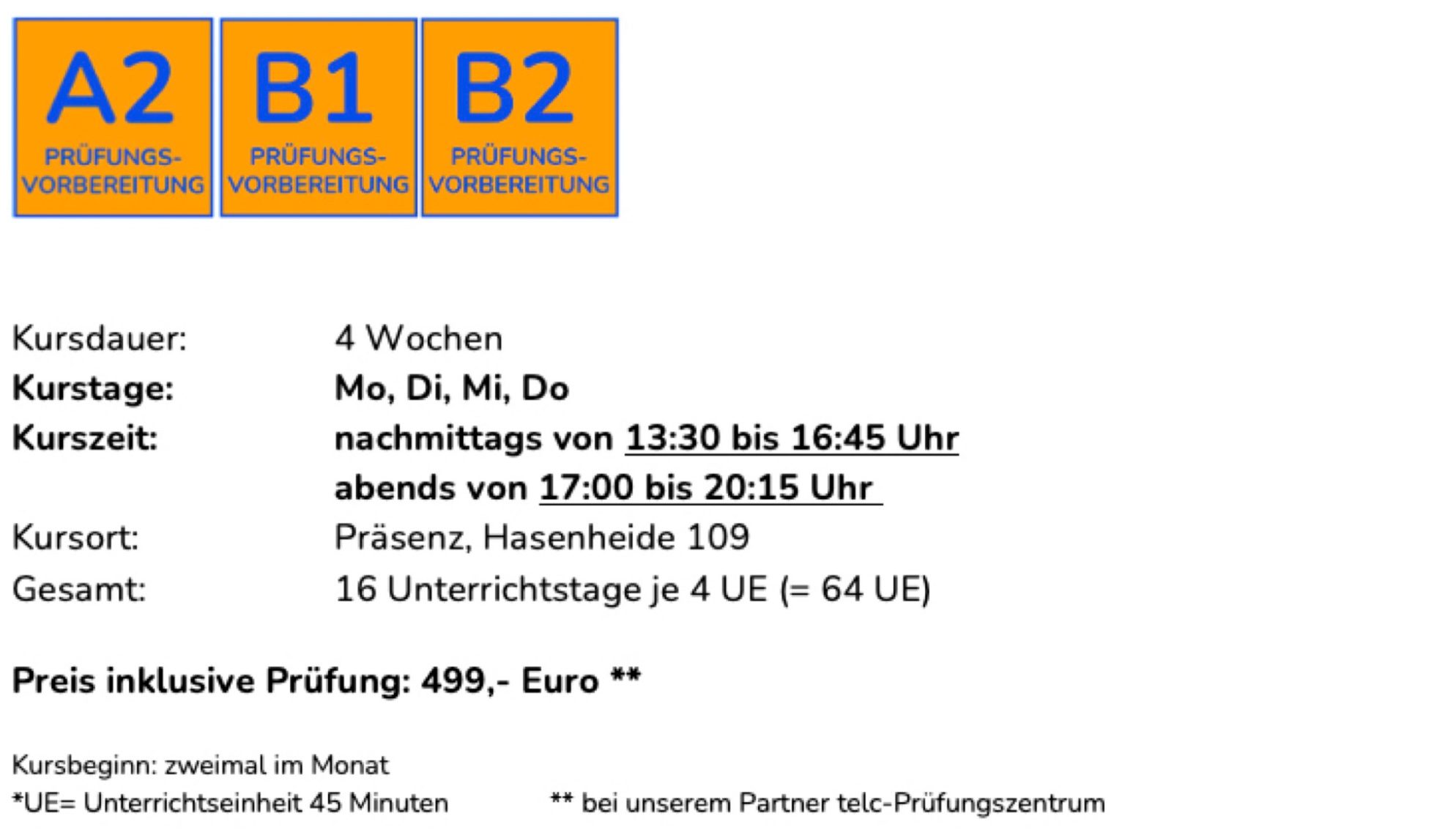 Unsere kompakten Vorbereitungskurse helfen Ihnen dabei, sich gezielt und effektiv auf die telc-Prüfungen vorzubereiten.